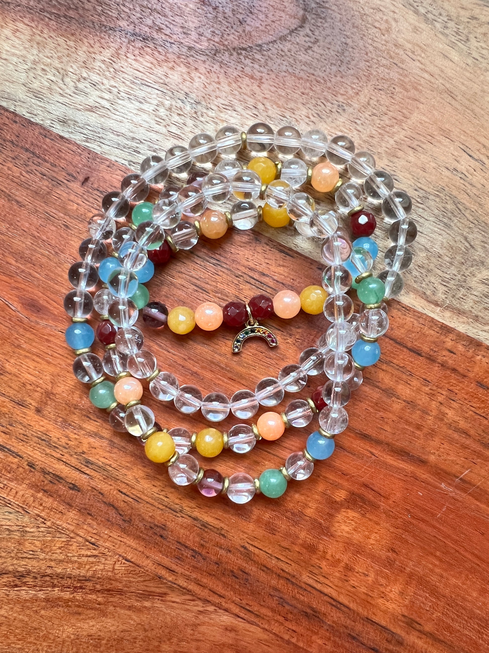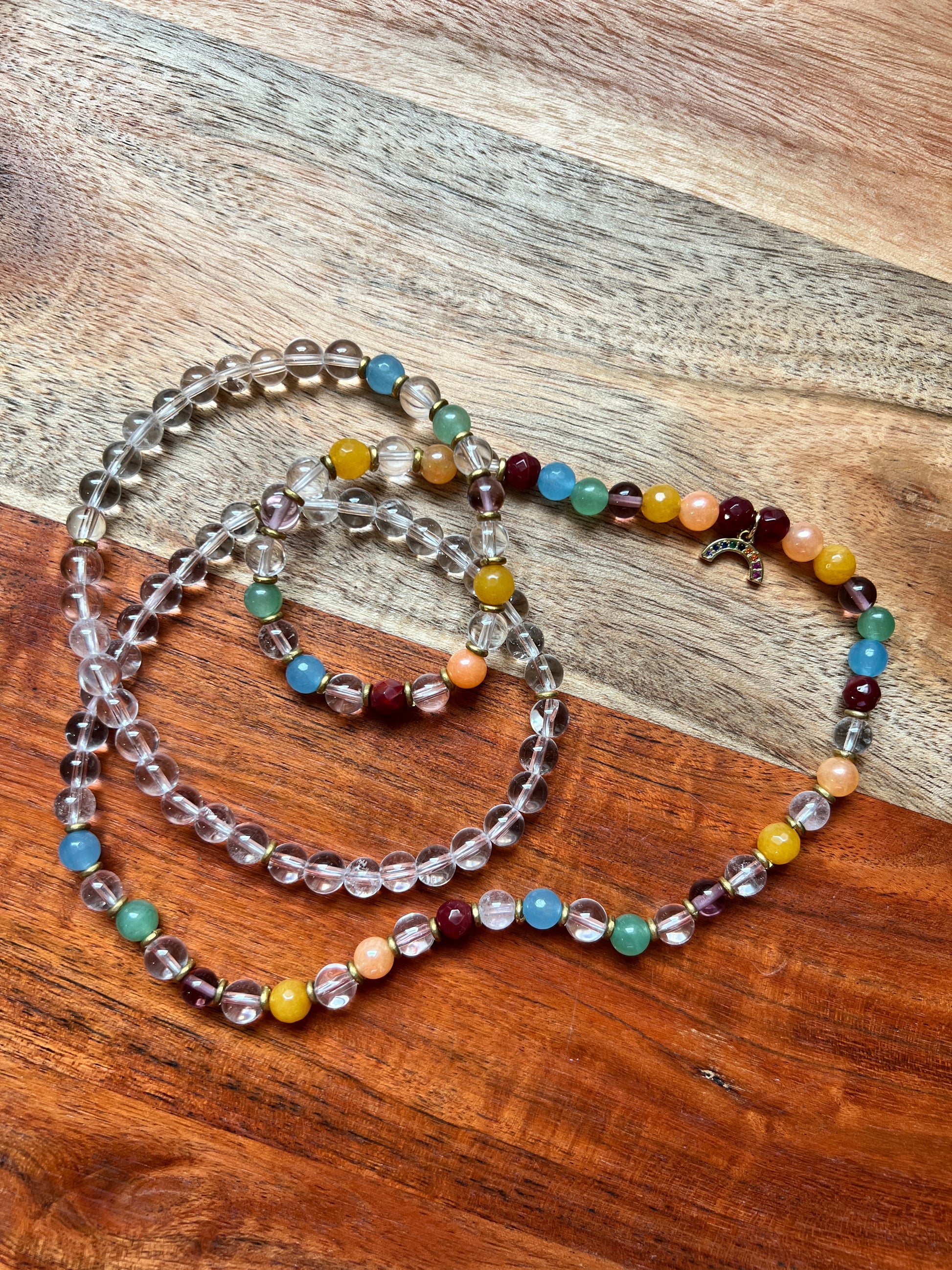 Esta hermosa pieza inspirada en el arco iris se puede usar como collar o como pulsera, enrollada alrededor de la muñeca varias veces, ya que es elástica. Tiene las tradicionales 108 piedras como las que tiene un Mala.