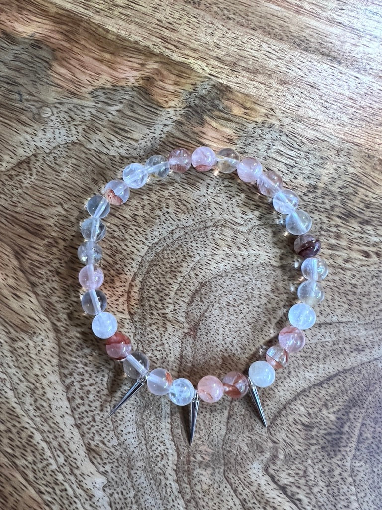El cuarzo hematoide también se conoce como cuarzo de fuego y es un maravilloso sanador. Esta pulsera tiene 3 púas plateadas.