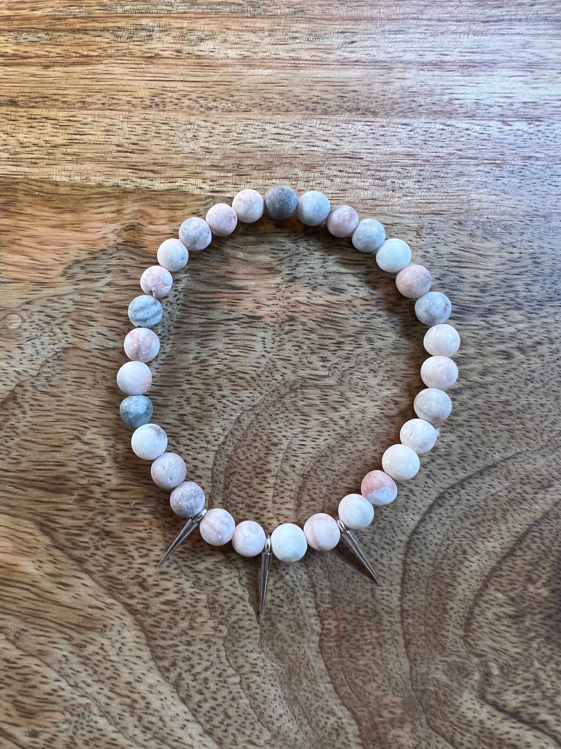 Estas piedras de 6 mm son de ópalo rosa mate y tienen algo de gris y blanco. Se combinan con 3 púas plateadas.