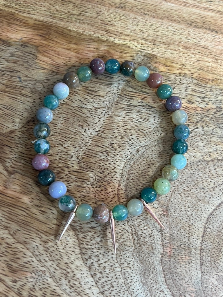 ¡El ágata musgosa es una piedra preciosa! Las cuentas tienen inclusiones y algunas son semitransparentes para que puedas sentarte y explorarlas con los ojos. Hay 3 púas de oro rosa en esta pulsera.
