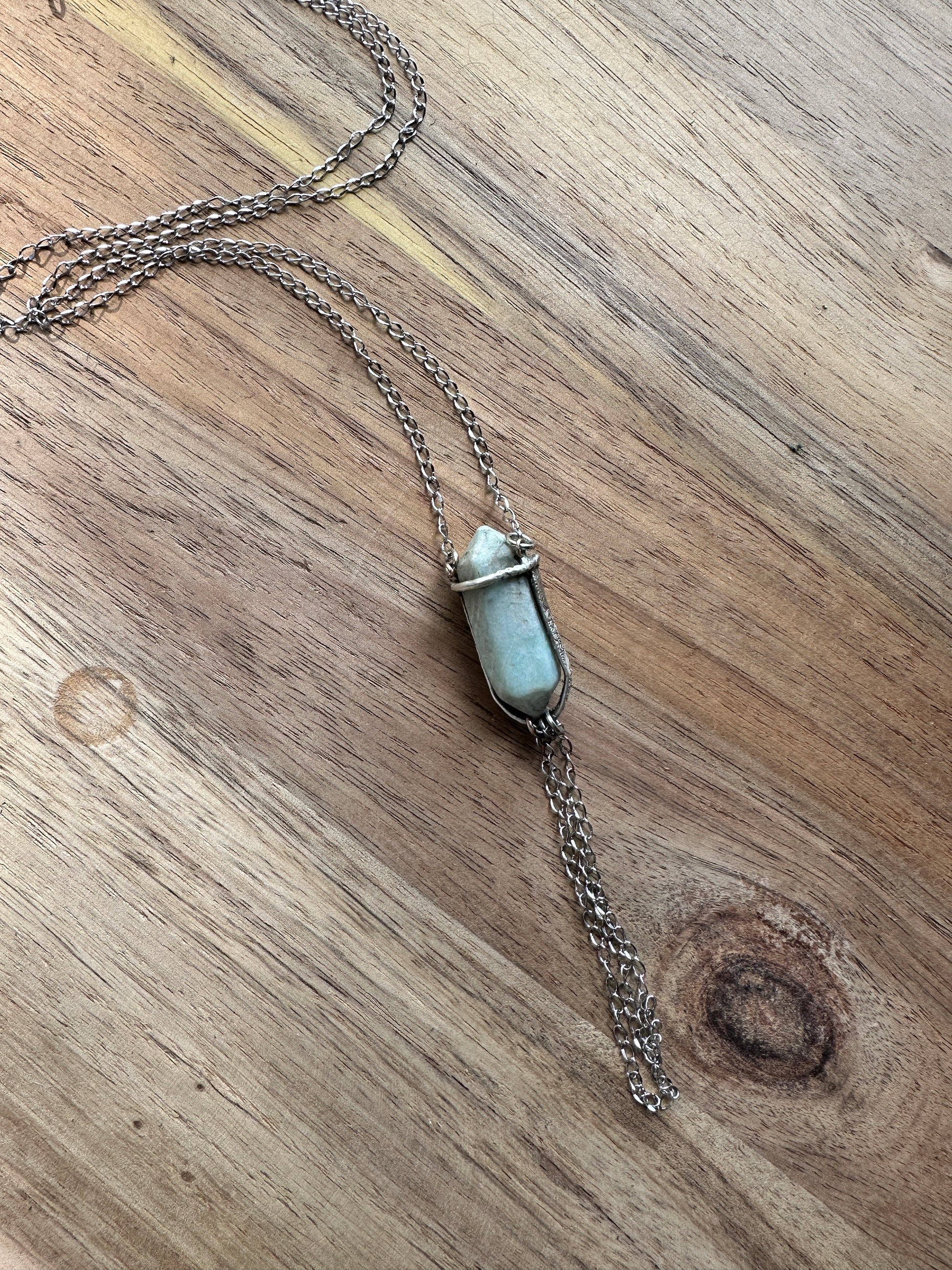 This sterling silver "cage" was smithed by myself and then the double terminated amazonite point was placed inside. The amazonite is secure and the necklace can be shortened if desired but not made longer.
