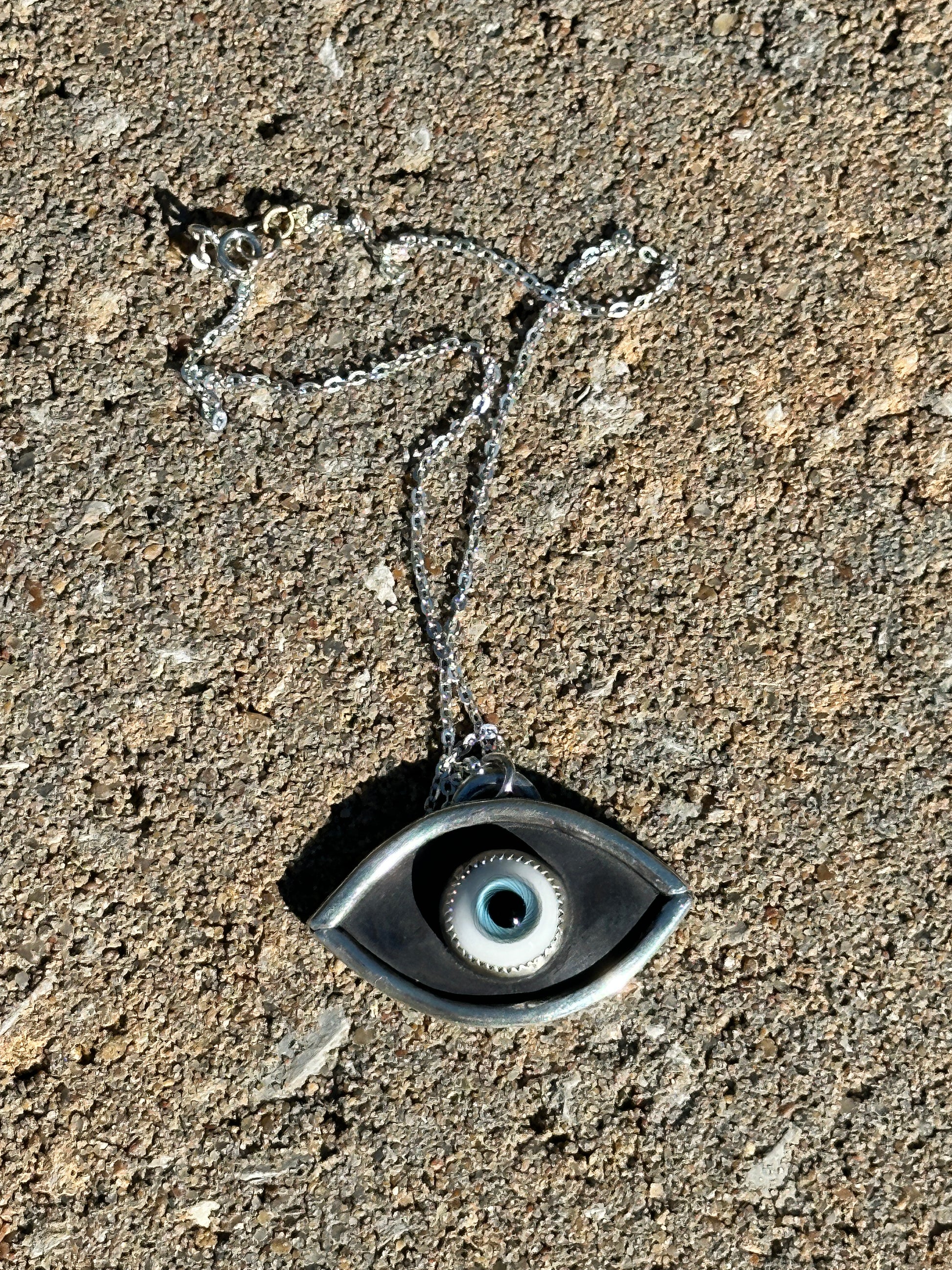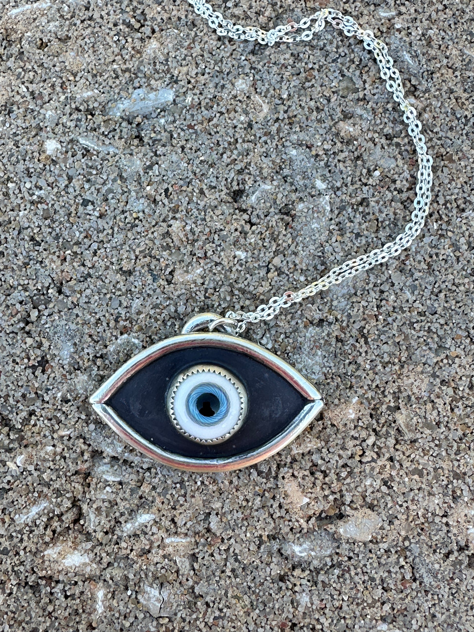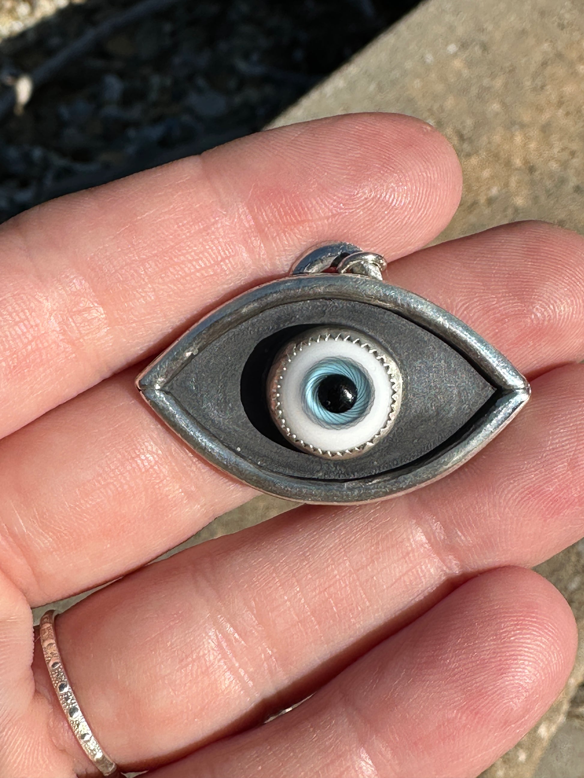 This glass eye cab is a beautiful light blue with a swirl effect that can be seen close up. The necklace is made entirely of sterling silver and hand smithed by yours truly. Eyes have long been seen as a protection talisman, to ward away bad energy or bad intentions from others.
