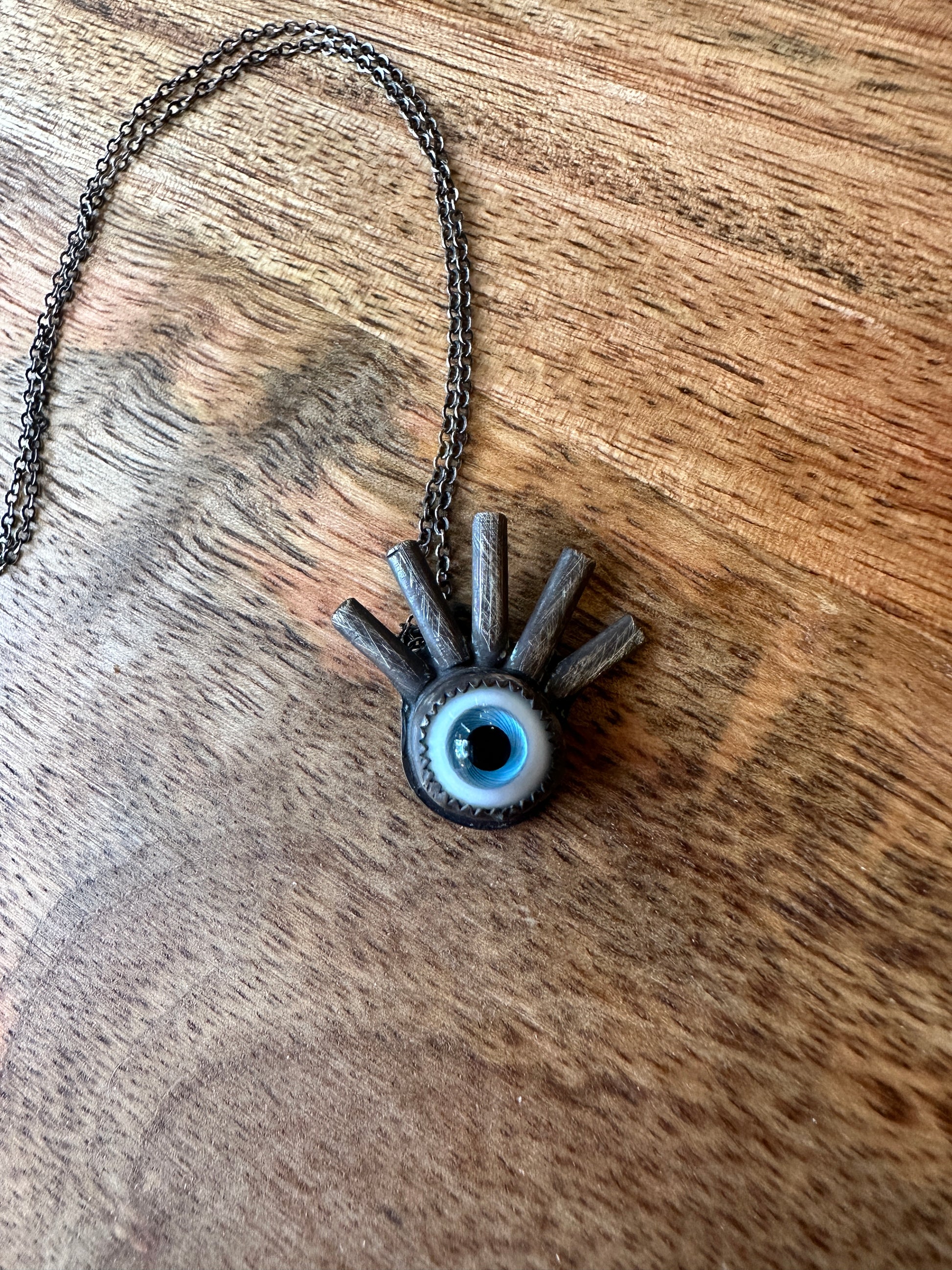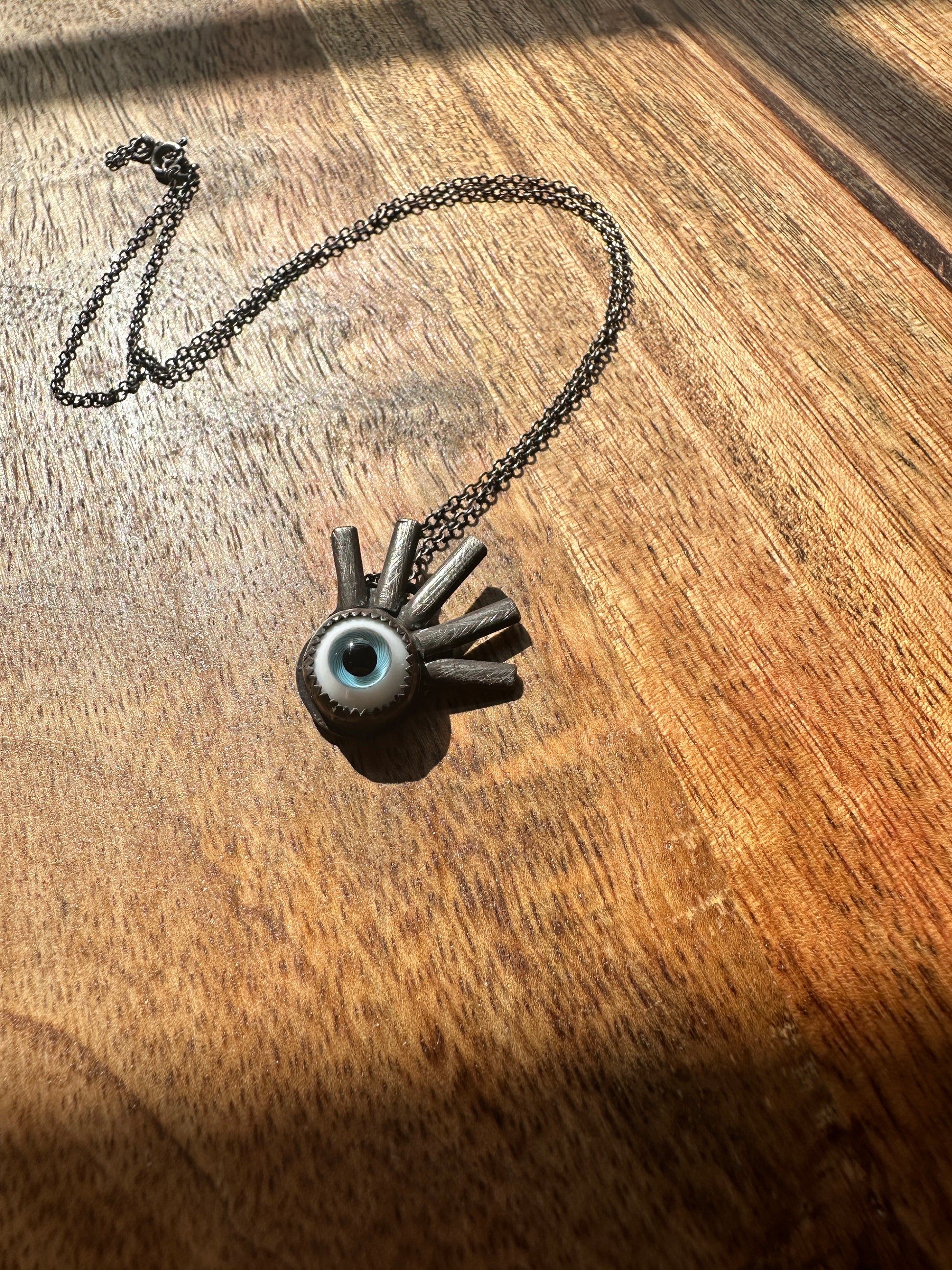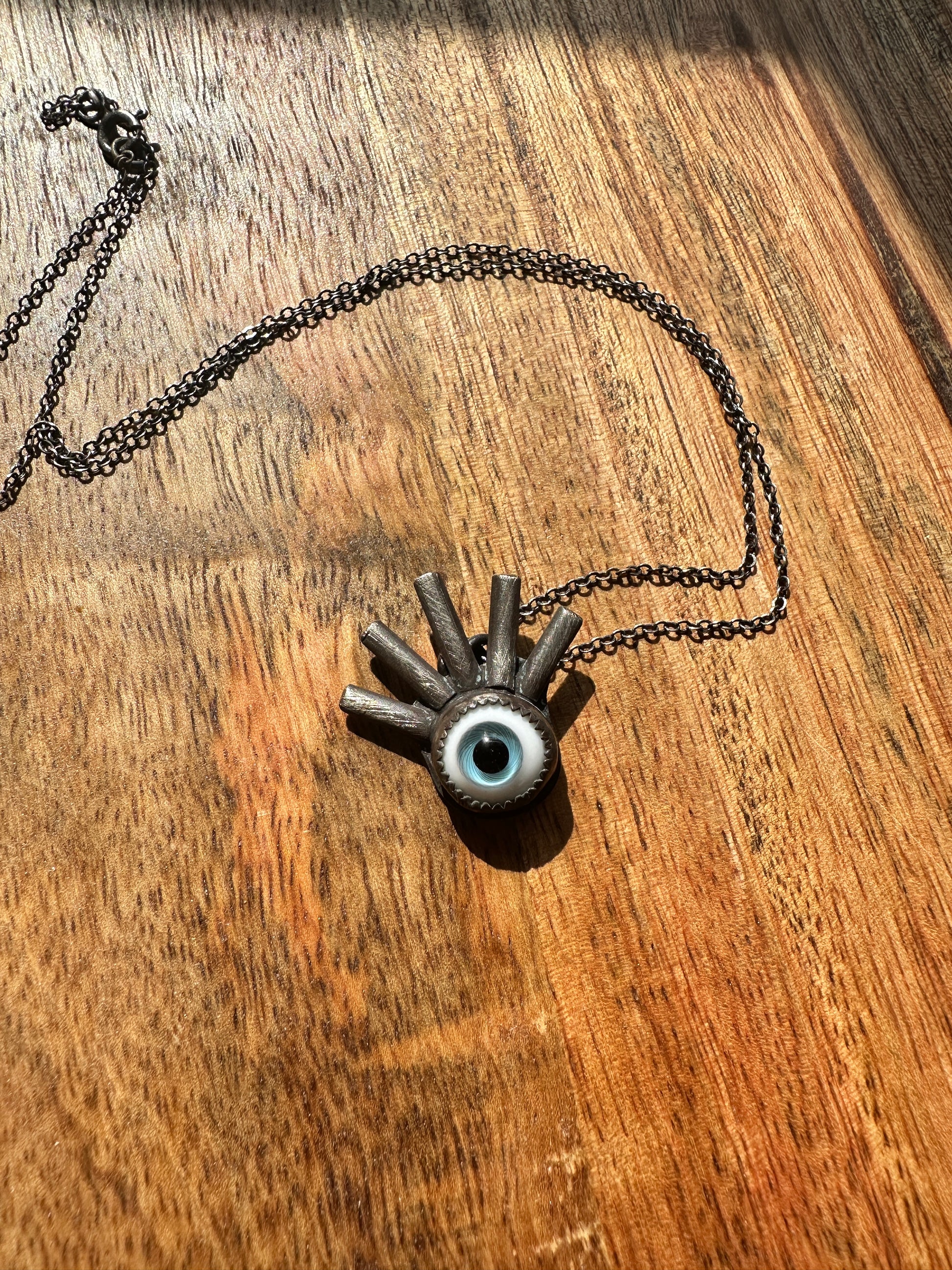 This light blue glass eye cab is set in sterling silver and hangs from a 16" sterling chain. This necklace serves as a talisman to protect against bad energy that comes in your direction.