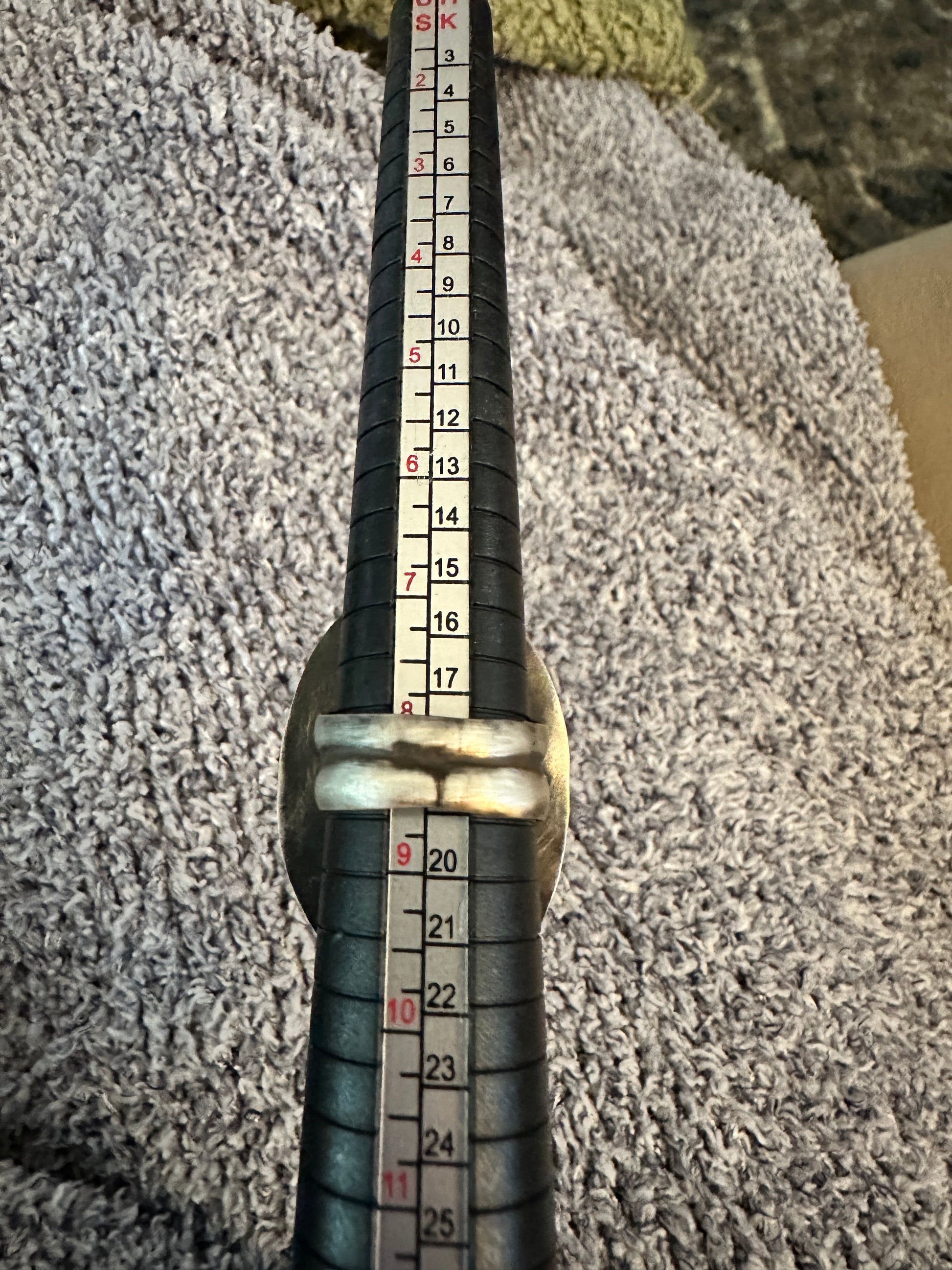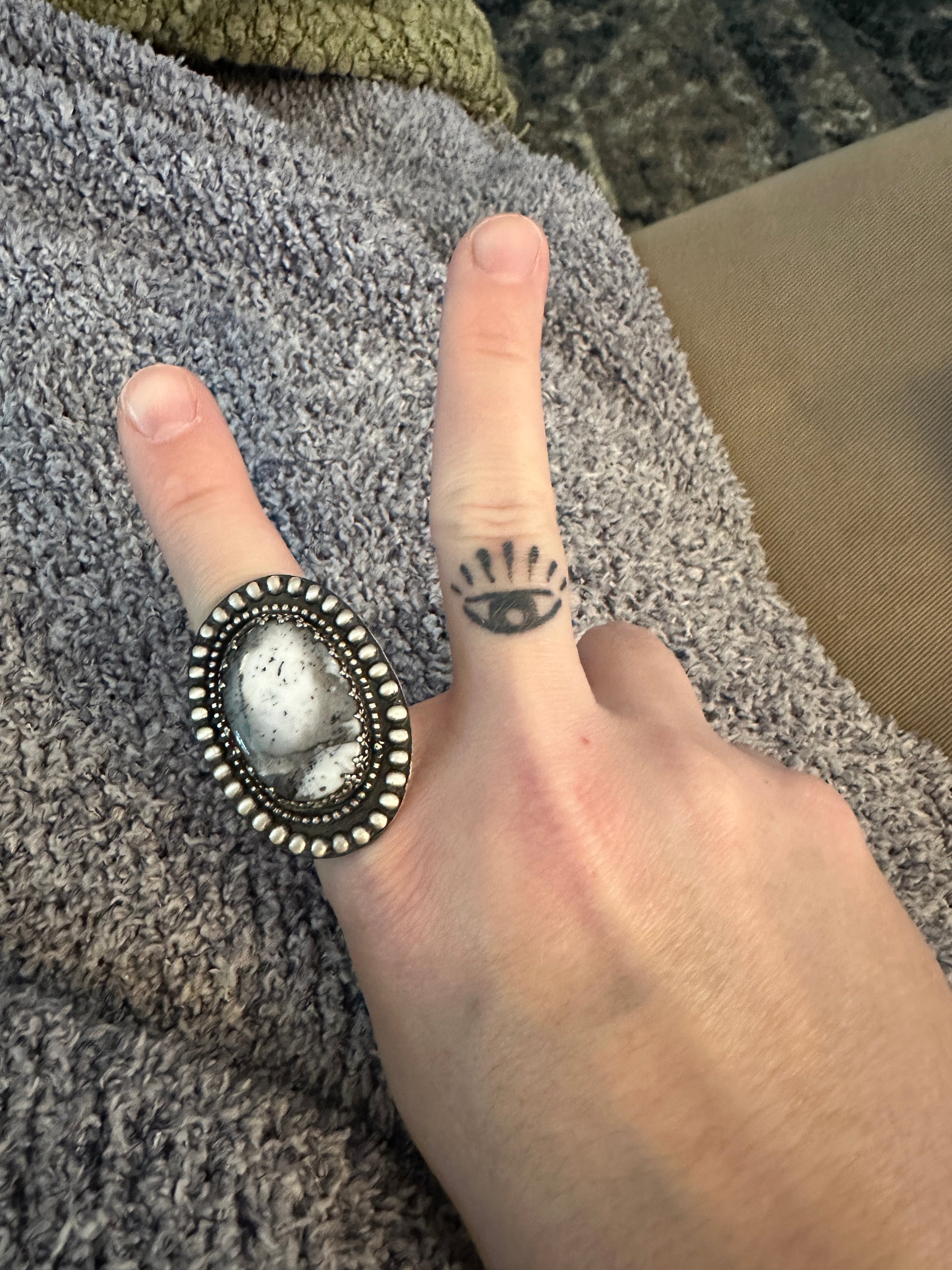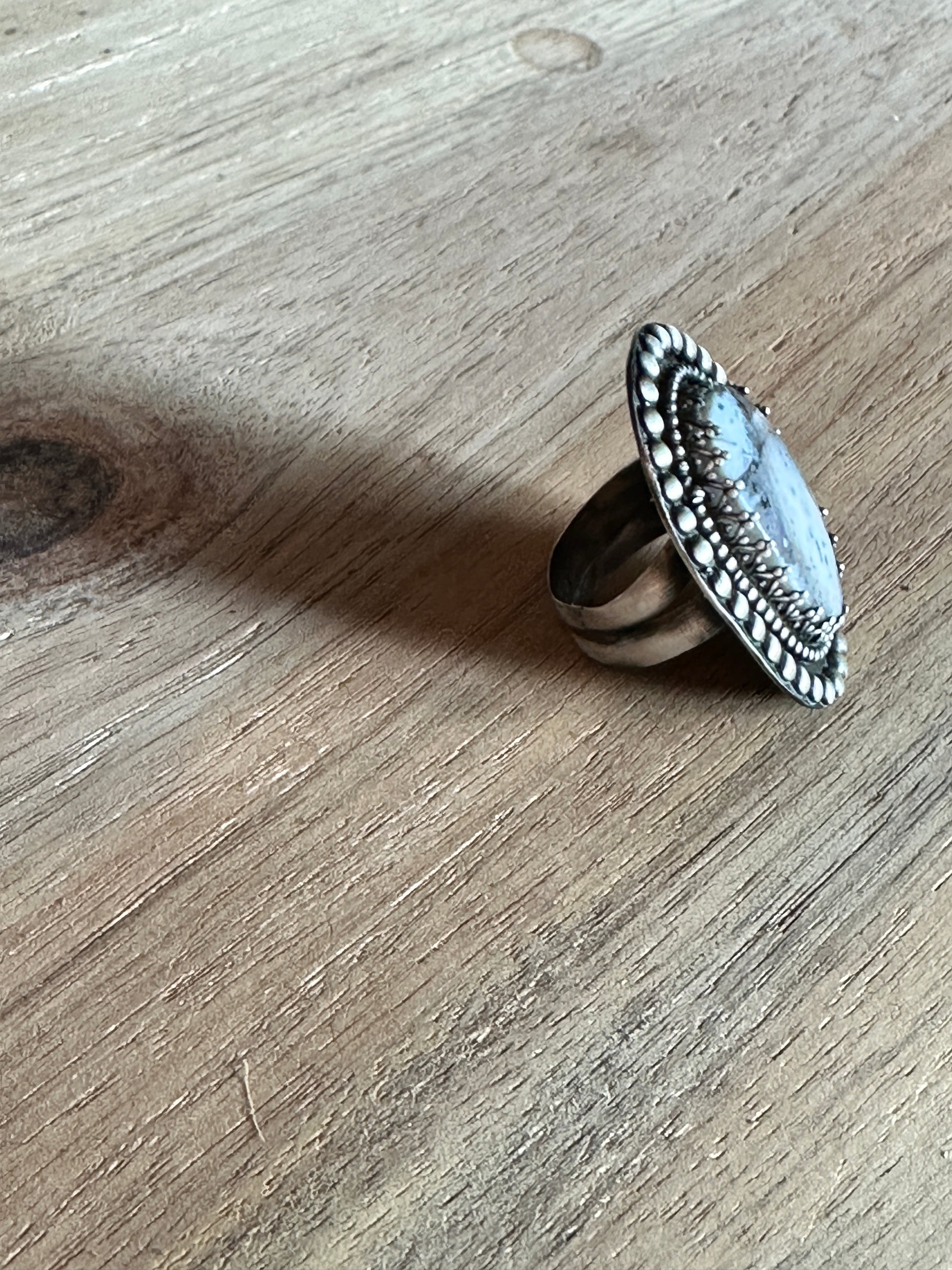 This large statement piece is a double banded ring with ball accents and an amazing dendritic opal at the center piece. The size can be seen in one of the pictures. It is a comfortable 8.5. If you need help sizing or knowing it will fit before purchase, message or email me!