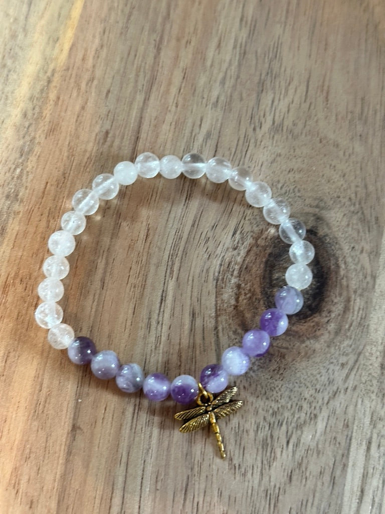 Clear quartz and chevron amethyst are put together in this piece to help promote peaceful and calm state of mind, especially while sleeping. This combination helps reduce stress when your focused intentions are on that path. The small dragonfly charm is aged brass.