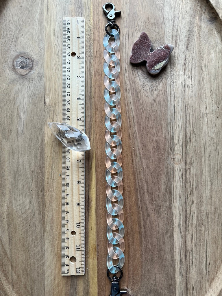This single chain has the palest peach and light blue links with gunmetal hardware.