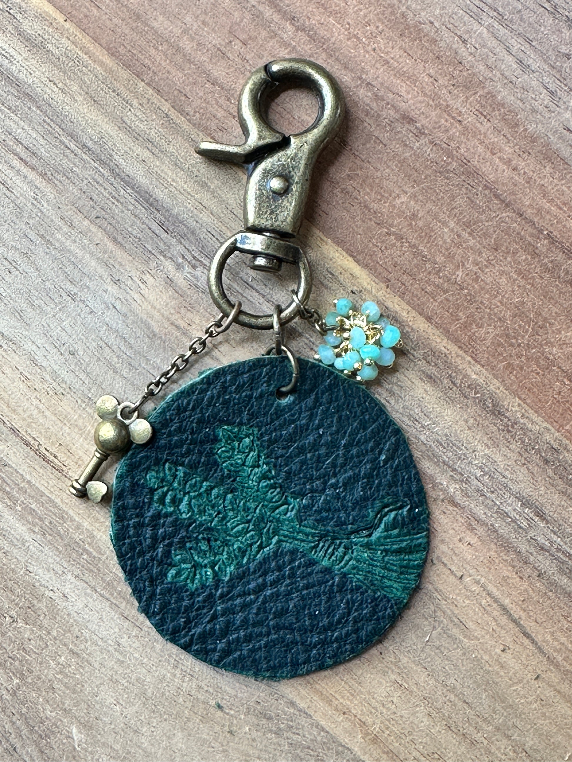 This is a one of a kind freehand of a lavender bouquet on leather with a small mouse key and green aventurine beads.