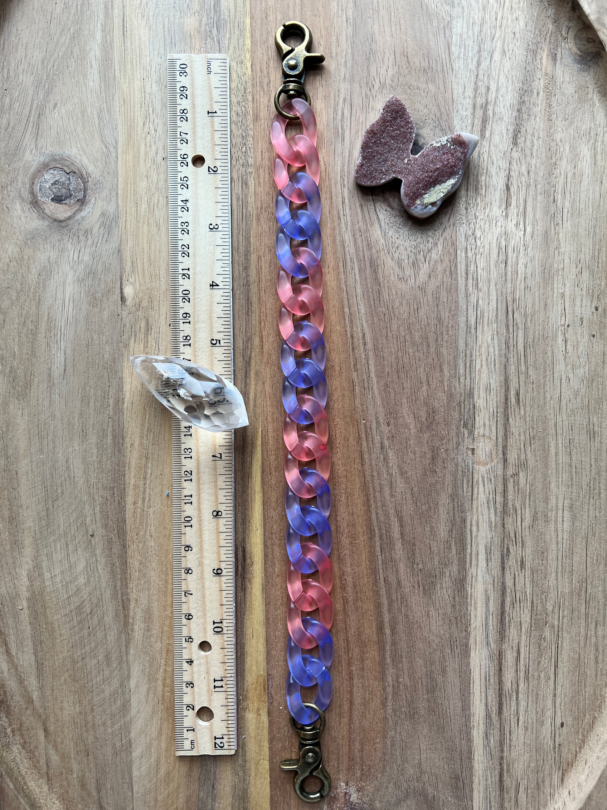 This single chain has salmon and periwinkle links with antique brass hardware.