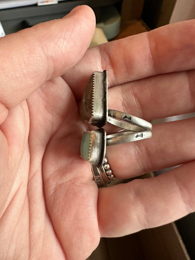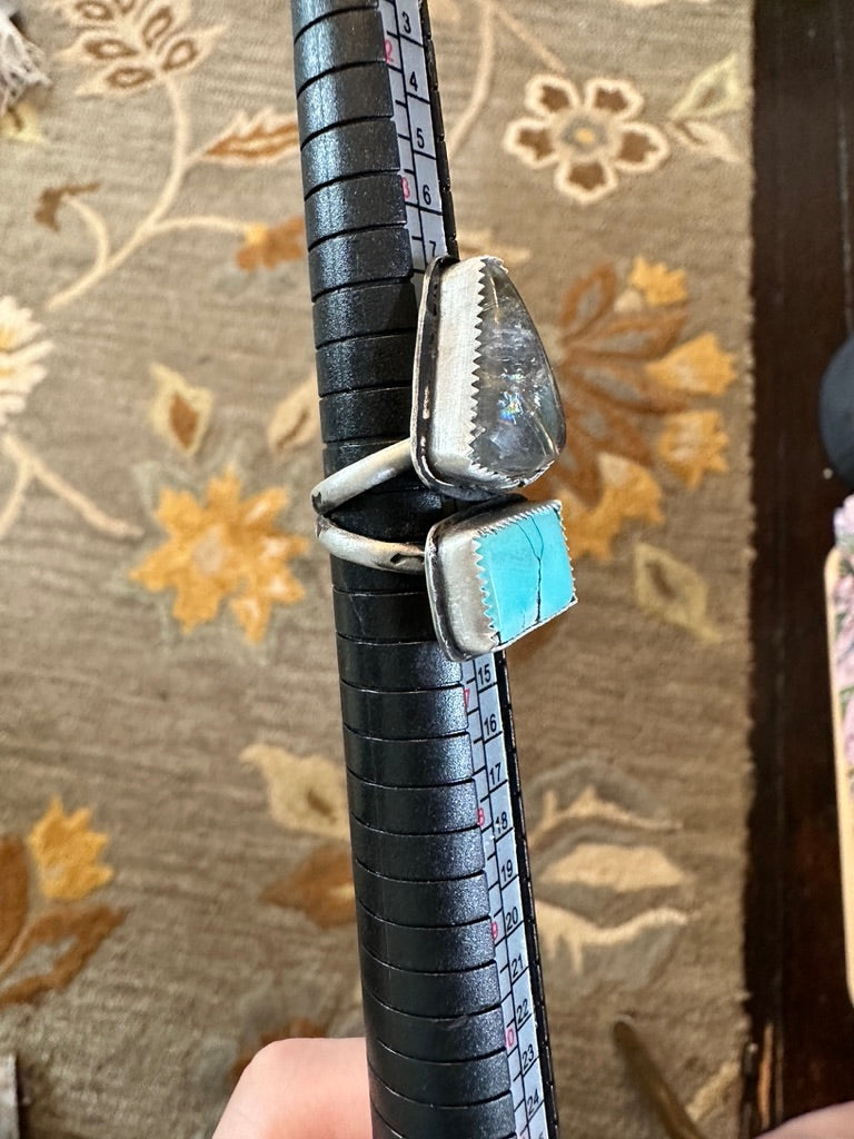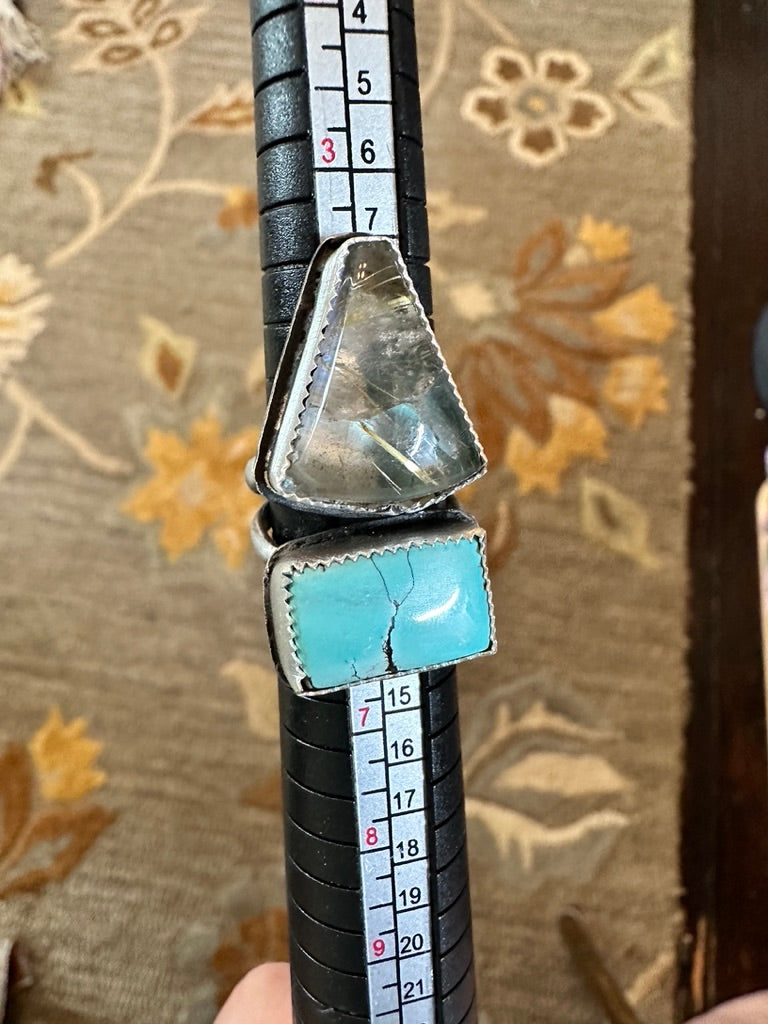 This stunning ring is thick gauge sterling silver, made to last generations, with a handmade stamped split band. The top stone is a doublet made from labradorite and golden rutile quartz. The bottom is Bao Canyon Turquoise.