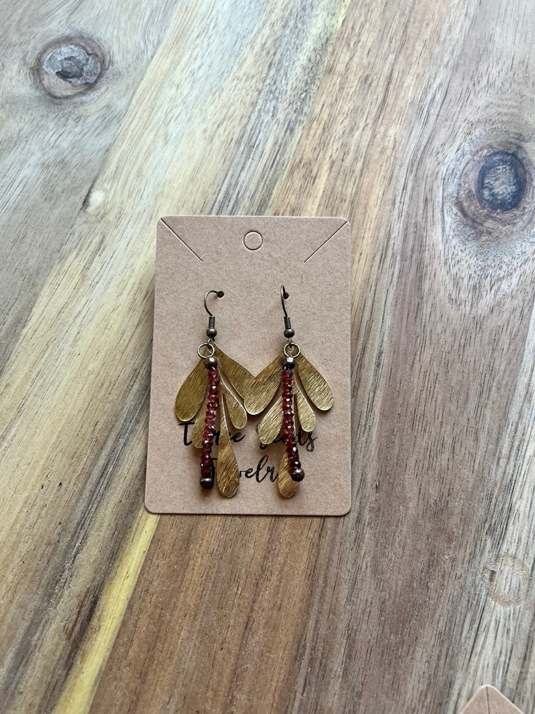 These are brass leaves with strands of faceted rubies hanging for a beautiful sparkle.