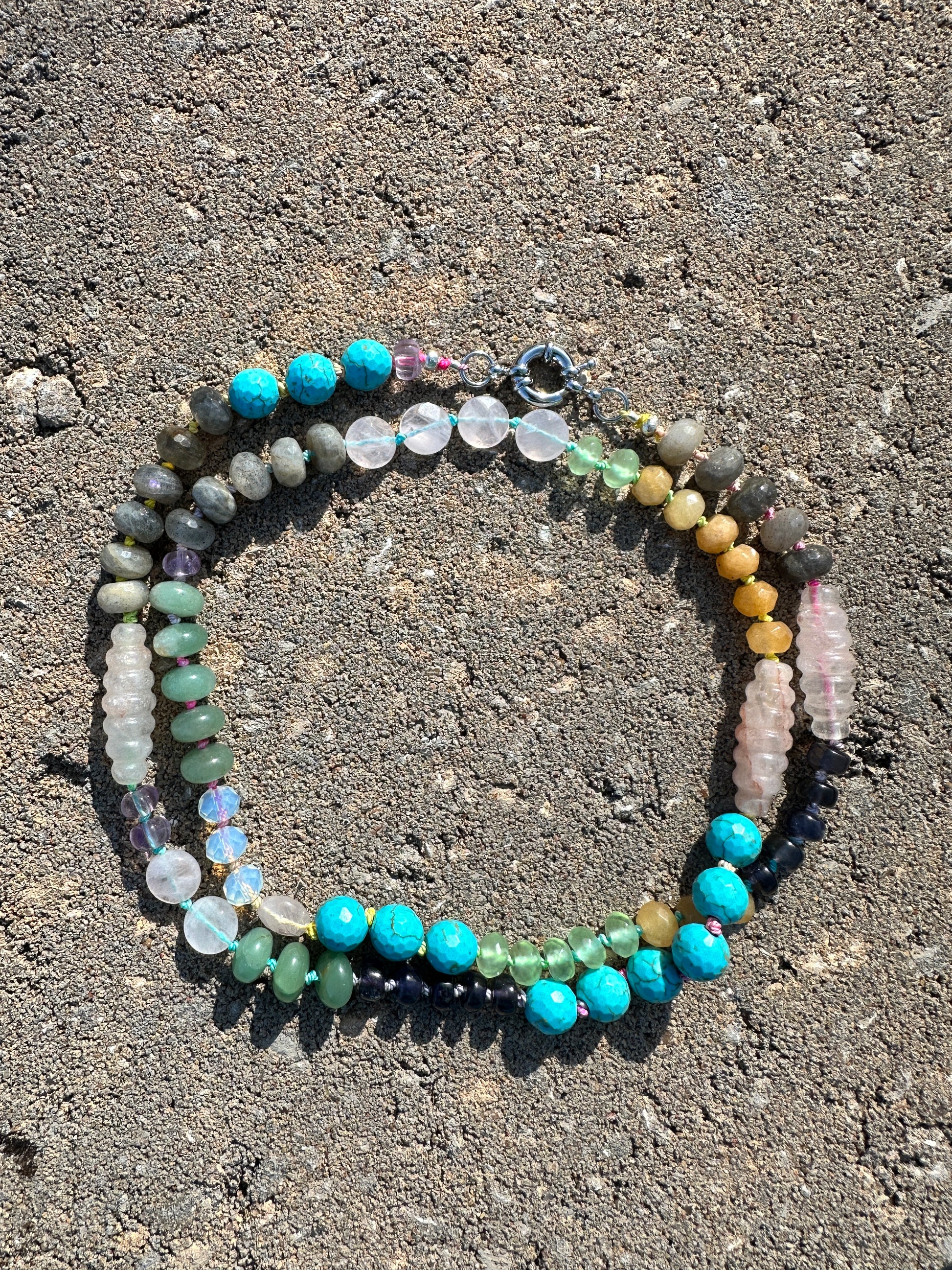 The stones are: labradorite, rose quartz, iolite, citrine, green aventurine, turquoise, opalite, quartz with red hematite inclusions and ametrine in various sizes and shapes. All handknotted on rainbow ombre silk with intention of love and good vibes forever