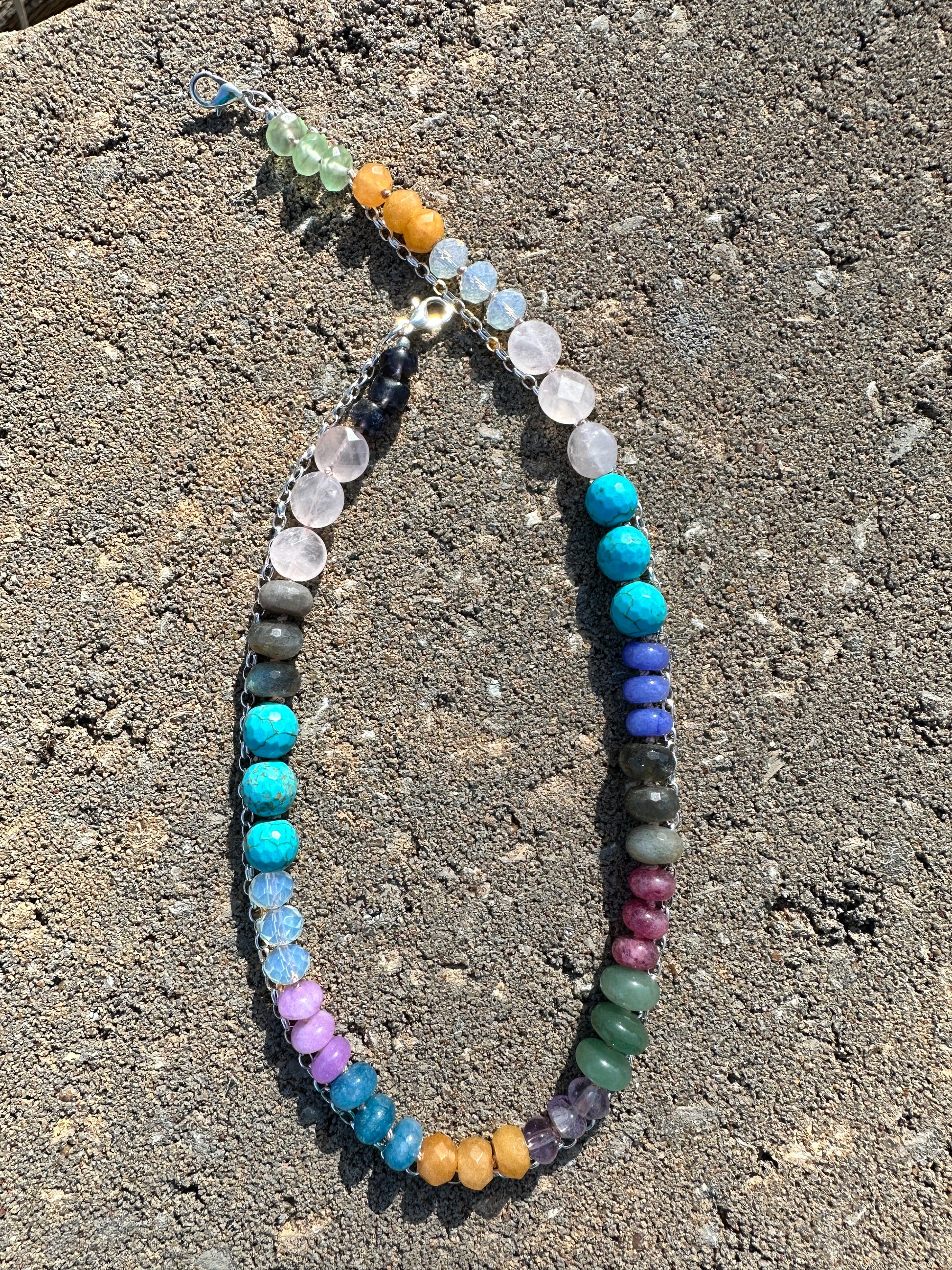 This is a convertible bracelet that wraps twice around your wrist but also doubles as bag flair. It features a sterling silver chain, sterling silver components, and a strand of 8ish mm stones that are: iolite, rose quartz, labradorite, turquoise, opalite, kunzite, apatite, honey quartz, ametrine, green jade, strawberry quartz, lilac jade, and green aventurine.