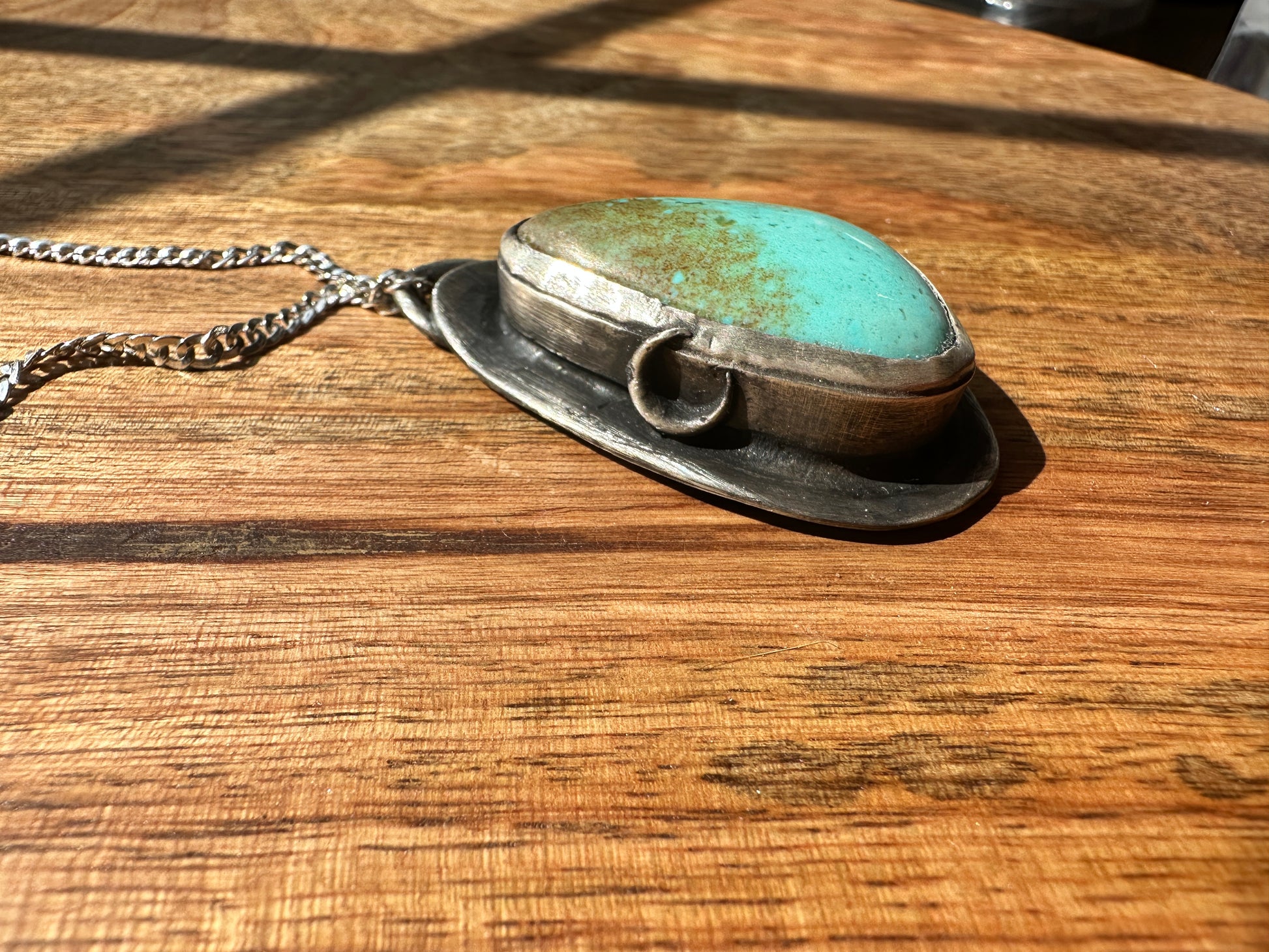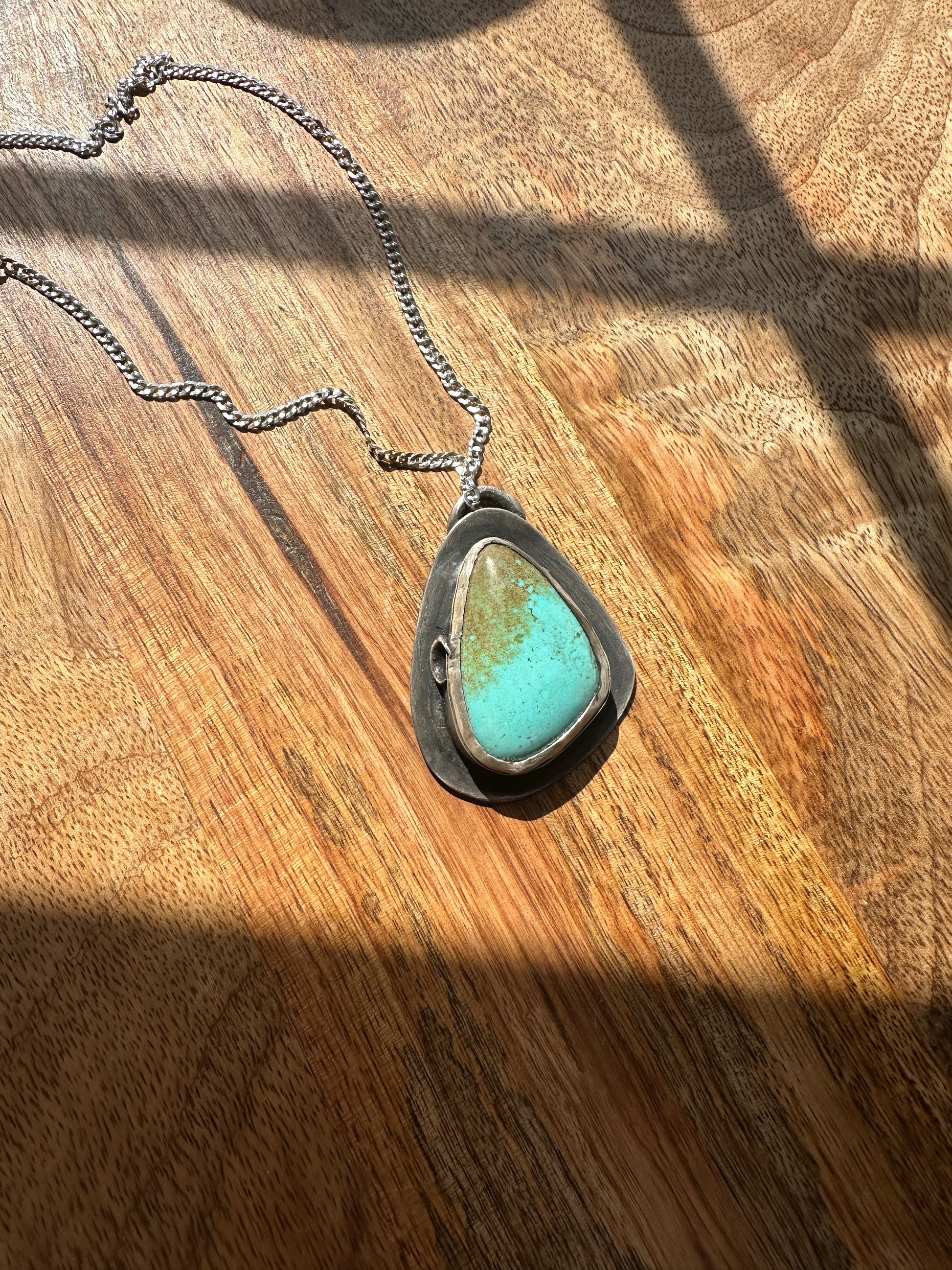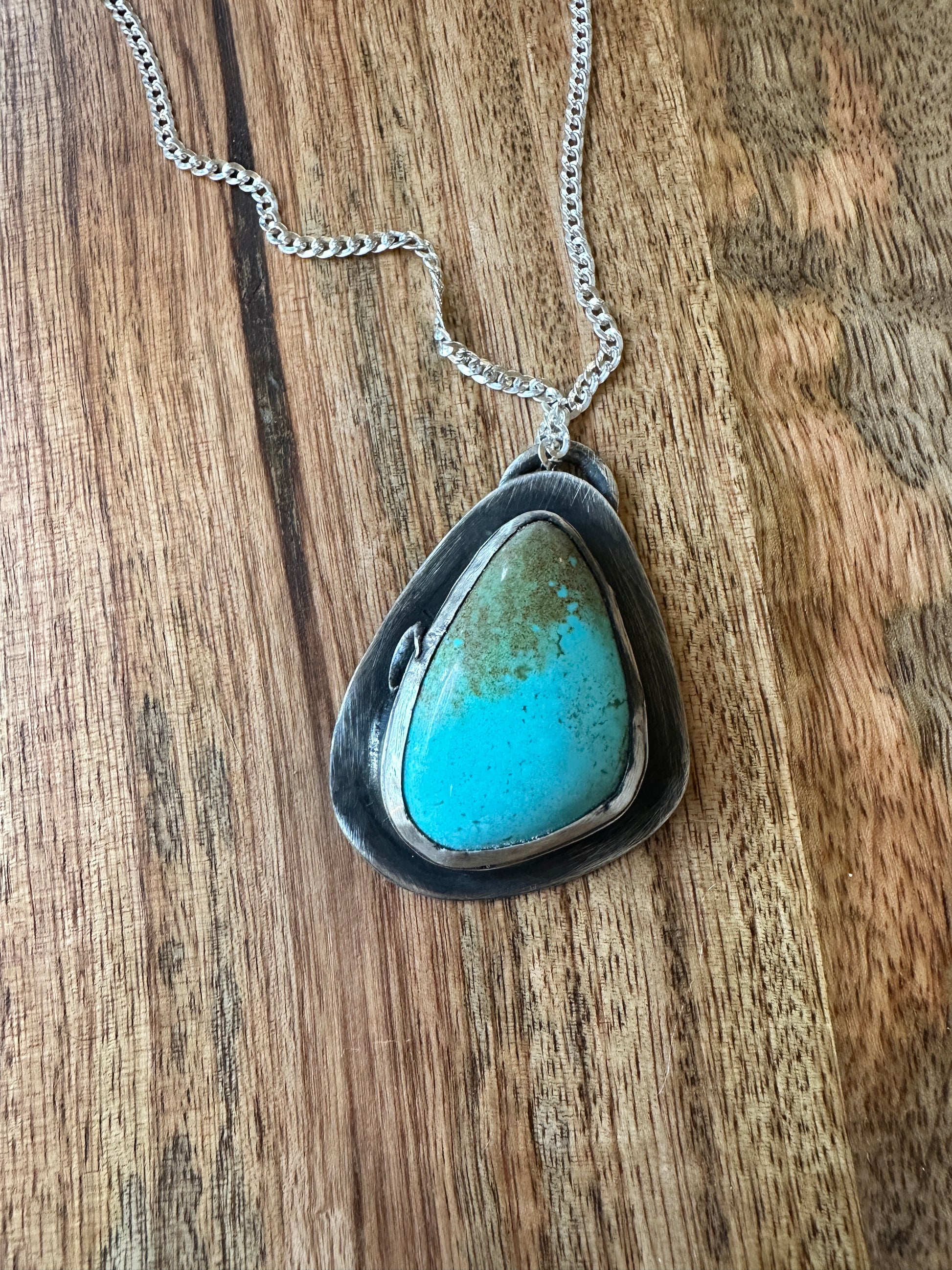 This thick and gorgeous piece of turquoise is set in a rustic sterling silver setting with a crescent moon adorning the side. It features a handmade thick bezel and is a one of a kind piece. It will sit on a patina curb chain at 17" long.