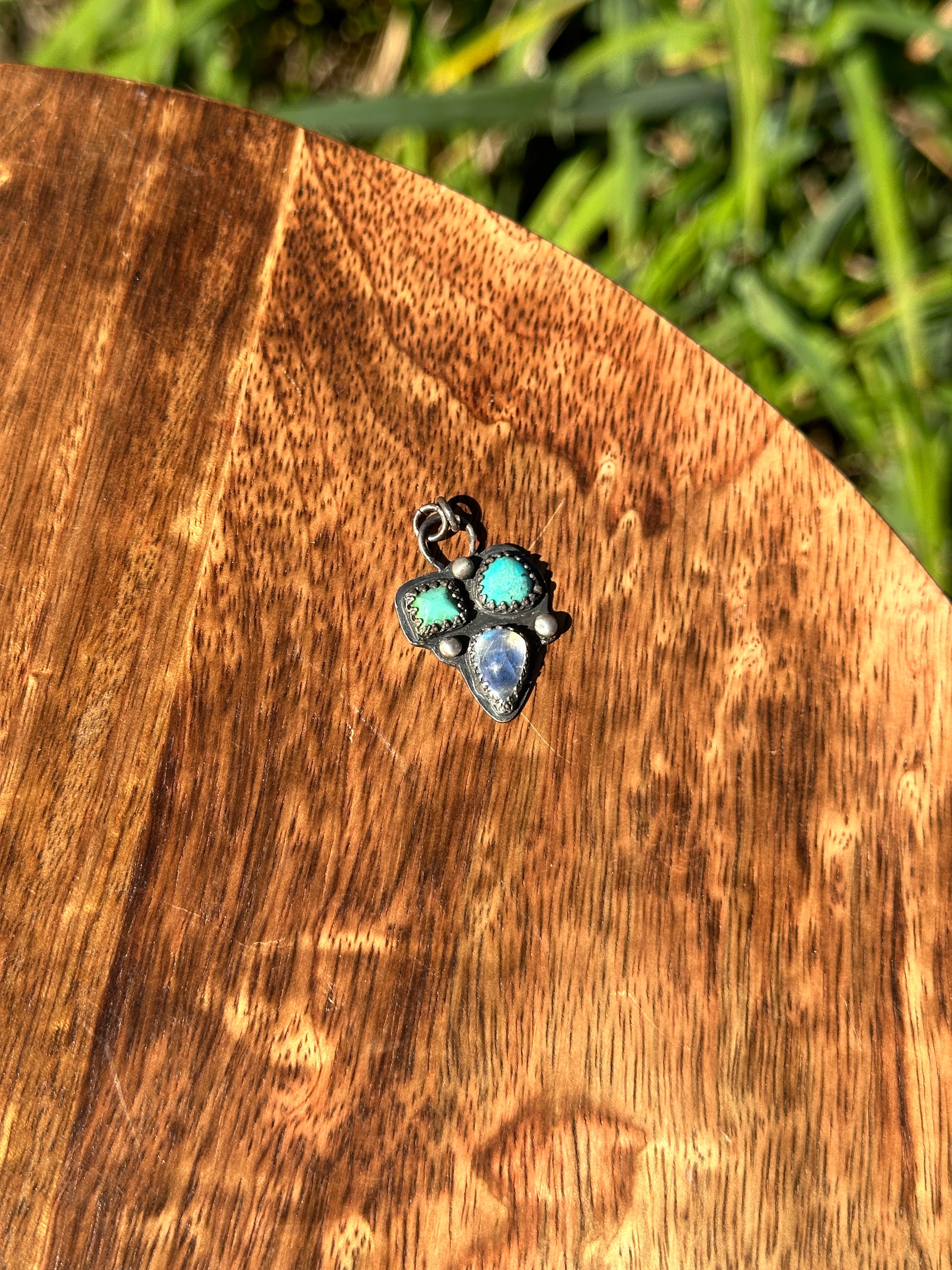 This one of a kind piece has a glowing blue flash rainbow moonstone tear drop and 2 brilliant blue pieces of turquoise, all set in sterling silver with a mysterious patina and sterling silver ball accents. This piece is a fun little addition to any neckmess.